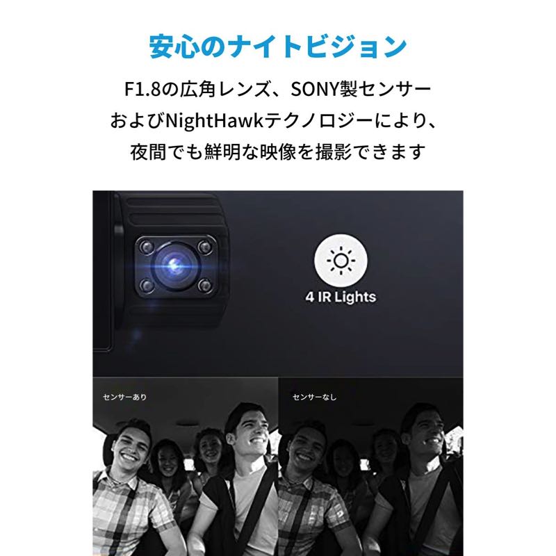 F1.8の広角レンズ、SONY製デュアル323センサーおよび独自技術NightHawkテクノロジーにより、夜間でも鮮明な映像を撮影することが可能です。GPS搭載