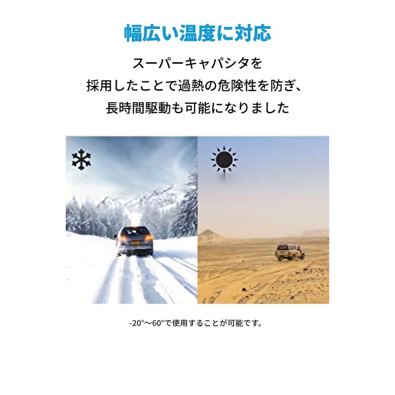 リチウムイオン電池の代わりにスーパーキャパシタを採用し、過熱状態になる危険性を防ぎ長時間駆動が可能になりました。また、-20度~60度の温度で使用することができます。製品仕様