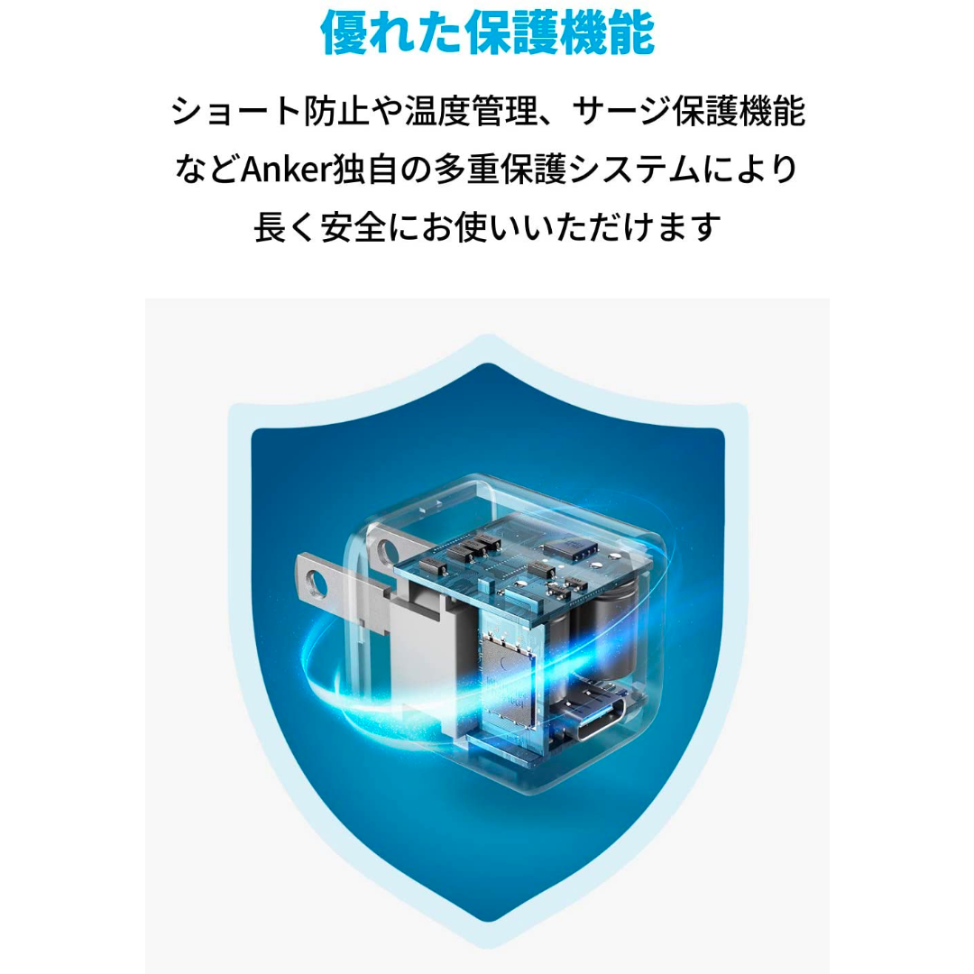 過電圧保護や電子回路のショート防止、温度管理など、Anker独自の多重保護システムにより、長く安全にお使いいただけます。PowerIQ 3.0 (Gen2)