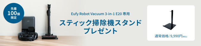 | パッケージ内容 | Eufy Robot Vacumm 3-in-1 E20、自動ゴミ収集ステーション(ダストバッグ付き)、電源コード、サイドブラシ、延長ノズル、クリーナーヘッド、コンビネーションノズル、ステーションパッド、クイックスタートガイド、安全マニュアル、18ヶ月保証 + 6ヶ月 (Ankerで会員登録後) 、カスタマーサポート |