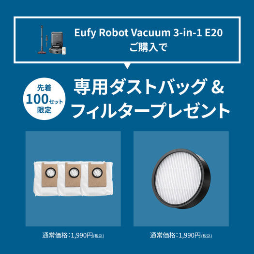 パッケージ内容 Eufy Robot Vacumm 3-in-1 E20、自動ゴミ収集ステーション(ダストバッグ付き)、電源コード、サイドブラシ、延長ノズル、クリーナーヘッド、コンビネーションノズル、ステーションパッド、クイックスタートガイド、安全マニュアル、18ヶ月保証 + 6ヶ月 (Ankerで会員登録後) 、カスタマーサポート