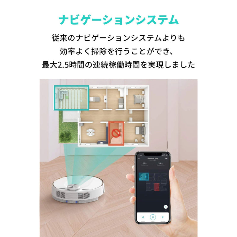 Eufy Cleanアプリと連携することで、掃除の開始/停止、掃除予約、吸引力の調整 (静音〜最大の4段階) 、モッピングモード時の水量調節 (3段階) 、進入禁止エリアや水拭き禁止エリア等の指定ができます。外出先での操作も可能です。