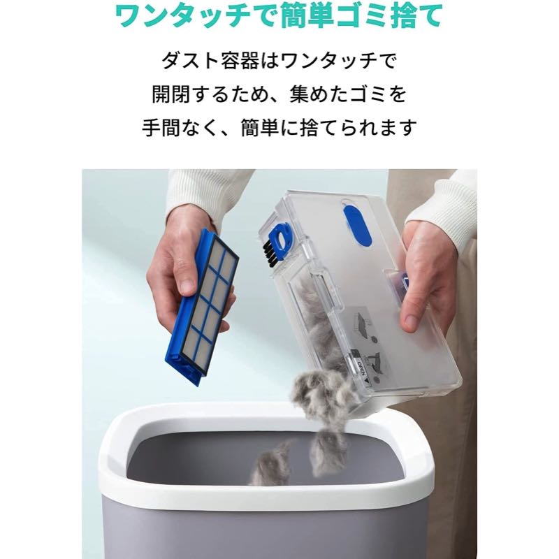 | パッケージ内容 | Eufy RoboVac L70 Hybrid、充電ステーション、電源アダプタ、防水パッド、モップモジュール (水洗い可能なモッピングクロス付き)、清掃ブラシ、取扱説明書、クイックスタートガイド、18ヶ月保証 + 6ヶ月 (Ankerで会員登録後)、カスタマーサポート |