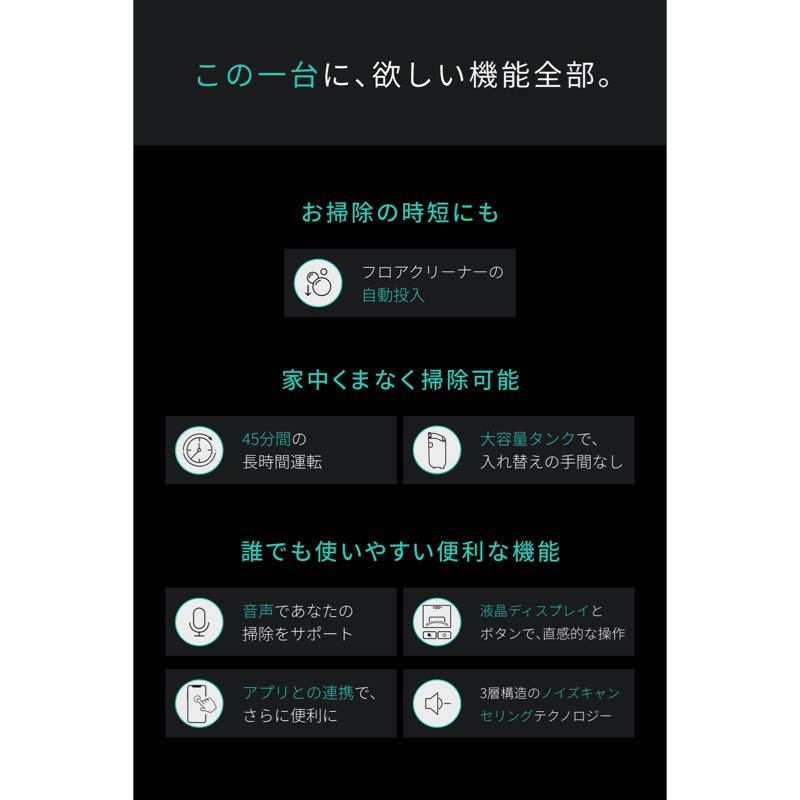 | パッケージ内容 | MACH V1、充電ベース、交換用高性能フィルター、交換用回転ブラシ、フロアクリーナー、清掃ツール、取扱説明書、18ヶ月保証 + 6ヶ月 (Ankerで会員登録後) 、カスタマーサポート | ||