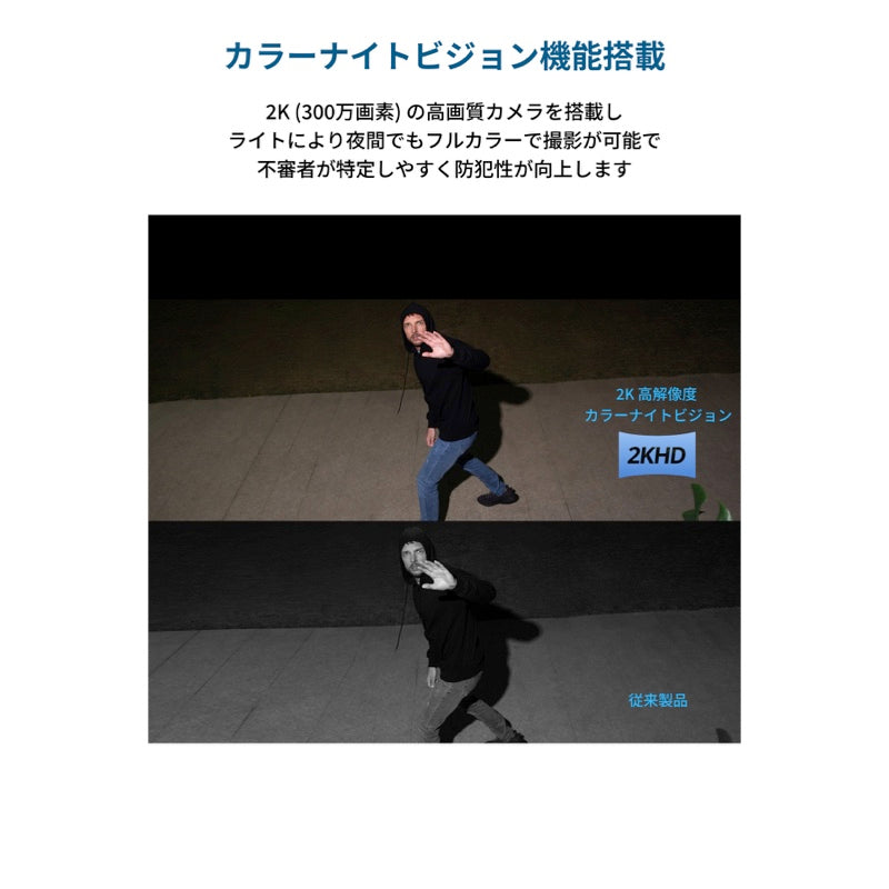 2K (300万画素) の高画質で細部まで鮮明に映し、被写体のわずかな動きや表情まで見逃しません。本体に搭載されたカラーナイトビジョン機能で、夜間でもカラーではっきりとした映像を残すことができ、不審者が特定しやすく防犯性が向上します。AIカメラ搭載