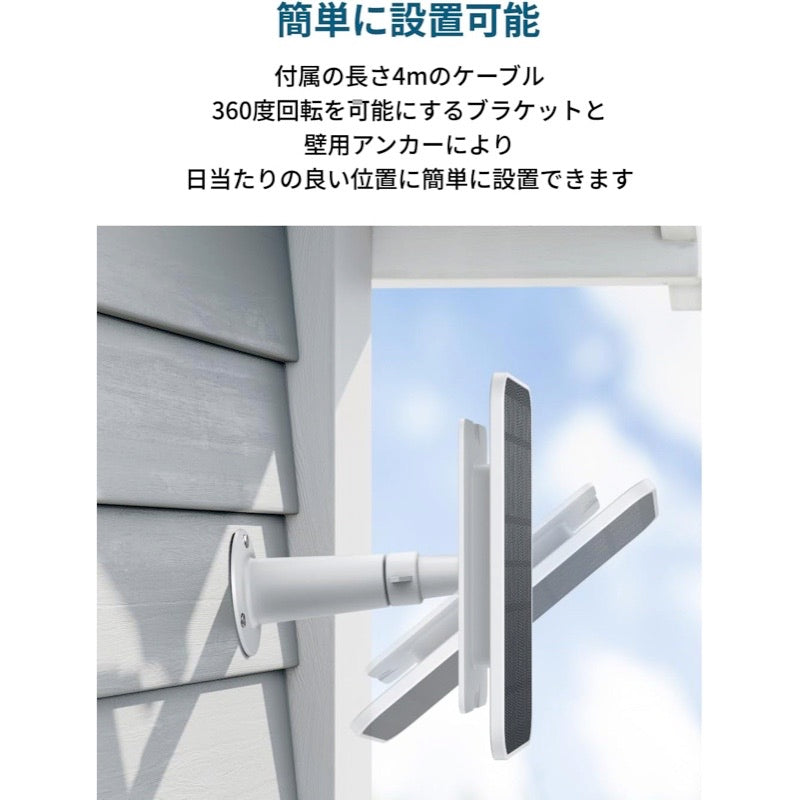 付属の長さ4mのケーブル、360度回転を可能にするブラケットと壁用アンカーにより、日当たりの良い位置に簡単に設置できます。
