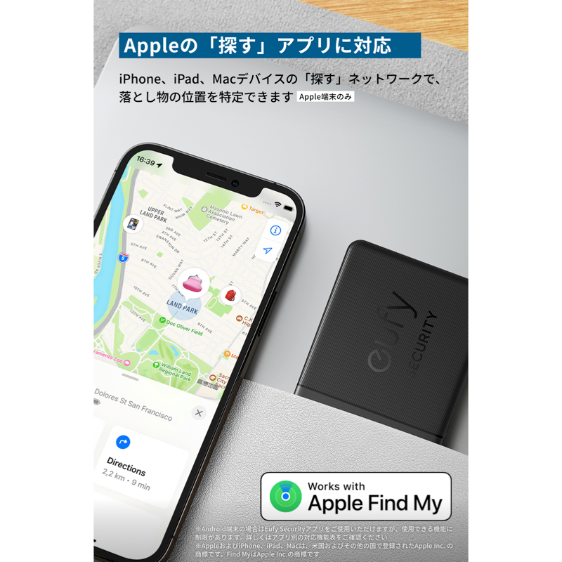 約2.6mmのカード型で、財布やカードケースにスッキリと収まります。Appleの「探す」に対応