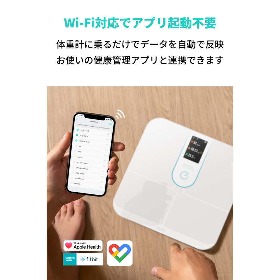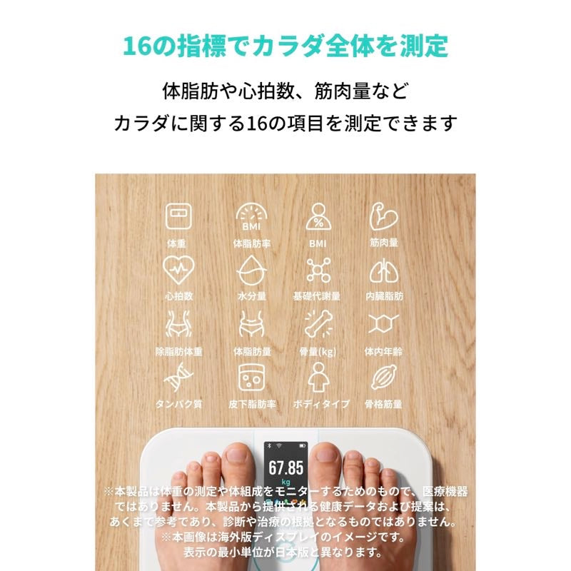 体重やBMI、体脂肪率などの基本情報のみでなく、心拍数、筋肉量、骨量、体年齢、皮下脂肪率などのカラダに関する16の項目を測定できます。Wi-Fi / Bluetooth接続に対応