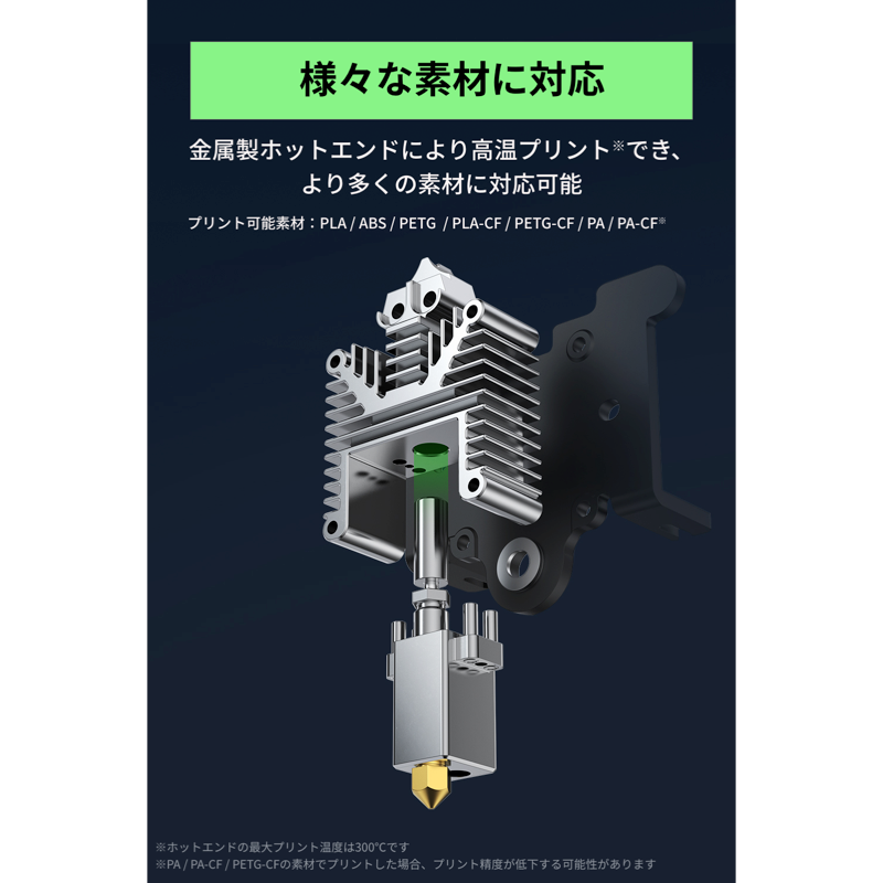 | 対応素材 | 1.75mm PLA / PETG / ABS / PLA-CF / PETG-CF / PA / PA-CF |