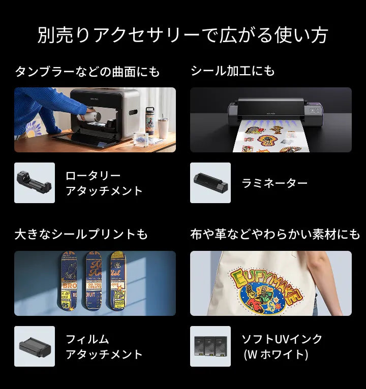 | 対応素材 | プラスチック、紙、皮革、木材、アクリル、金属など | ||||||