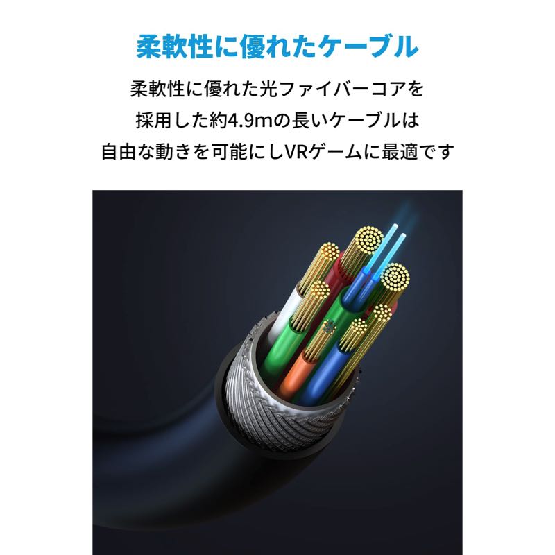柔軟性に優れた光ファイバーコアを採用した約4.9mの長いケーブルは、自由自在に動くことを可能にしVRゲームに最適です。
