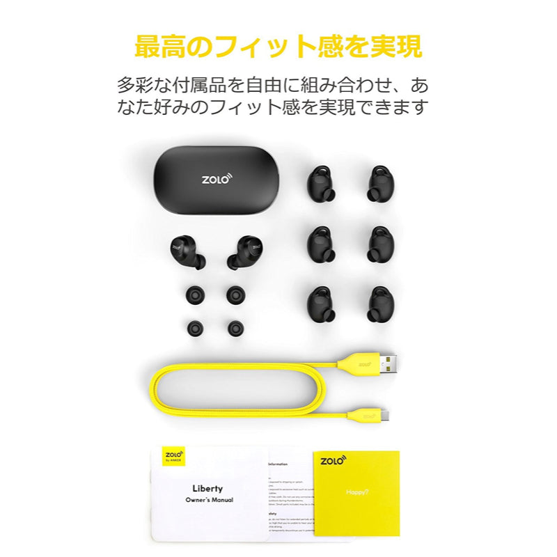 | パッケージ内容 | Zolo Liberty、充電ケース、GripFitジャケット(x 4)、イヤーチップ(x 3)、Micro USBケーブル、取扱説明書、18ヶ月保証 + 6ヶ月 (Ankerで会員登録後)、カスタマーサポート |